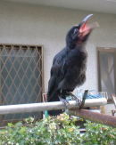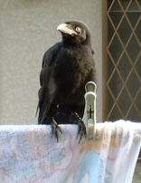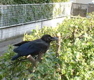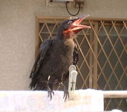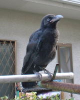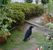 2001年の初夏、わが家の近くの公園の木の上にカラスの巣ができ、赤ちゃんが生まれたようでした。7月2日、その巣で育ったと思われる1羽のカラスが、どういうわけかわが家の庭にまよいこんできました。どうやらまだとぶことができないみたいです。