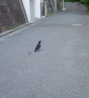 夕方までなき続けました夕暮れ頃、ついに意を決して物干し竿から飛び降りてあるきはじめました 道路を、巣のある公園の方にあるきはじめました