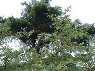 カラスの巣がある木 昼下がり、カラスの子がひょっこりわが家の庭にかおを出しました 物干し竿にとまったきり、ほとんど動かずに空を見上げています