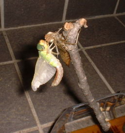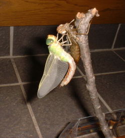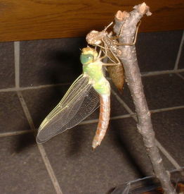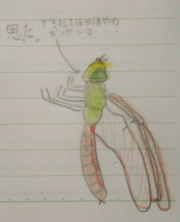 羽ははらよりものび、少し茶色に色がそまった。トンボのはらも、少しずつのびていく。トンボはつかれたようであまり動かない。わたしは、からからぬけるのが大へんだったんだなあと思った。